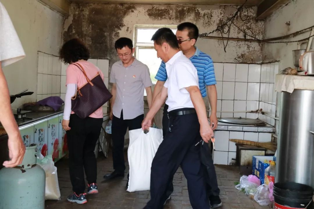 的领导干部以及学生代表带着提前准备好的米、面、粮油以及易直播