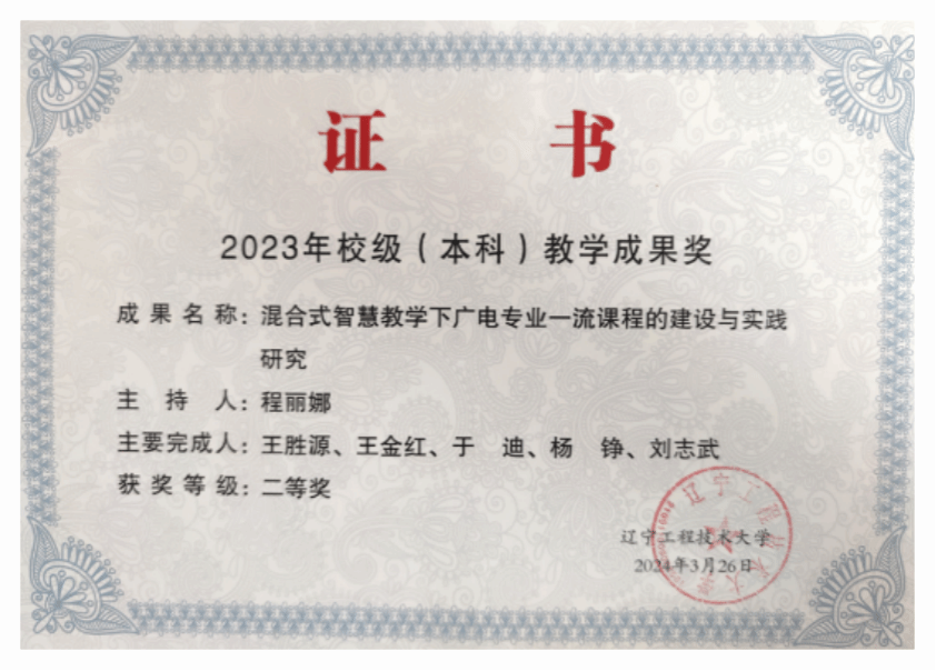• 2024年以本课程为核心申报的《混合式智慧教学下广电专业一流课程建设与实践研究》项目,获校级教学成果二等奖。